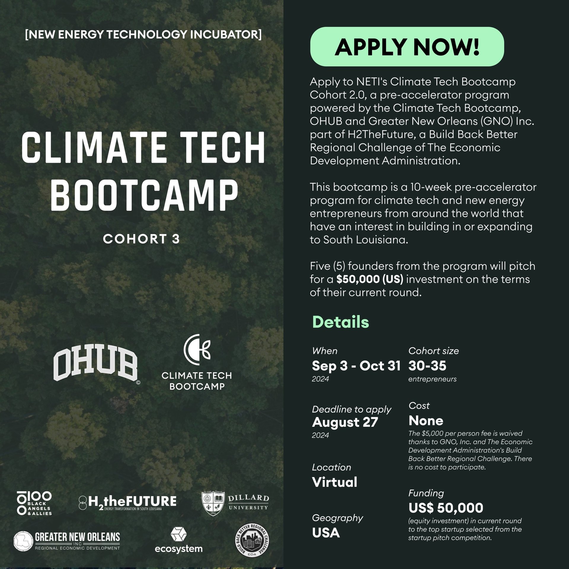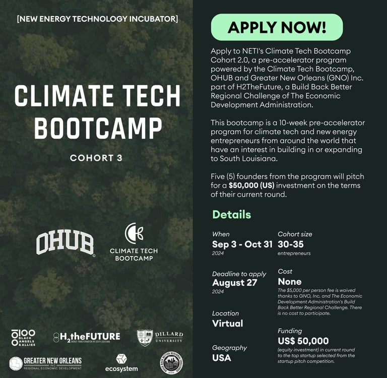 The OHUB x Neti Bootcamp presents a novel opportunity for startups focused on cleantech and climate resilience. This immersive program, especially catered to the southern states of Oklahoma & Louisiana, aims to guide emerging businesses through the complexities and intricacies of the industry. Among the participants, Chloroboost has notably secured its entry into this coveted accelerator, marking a significant milestone for the company and its growth trajectory.